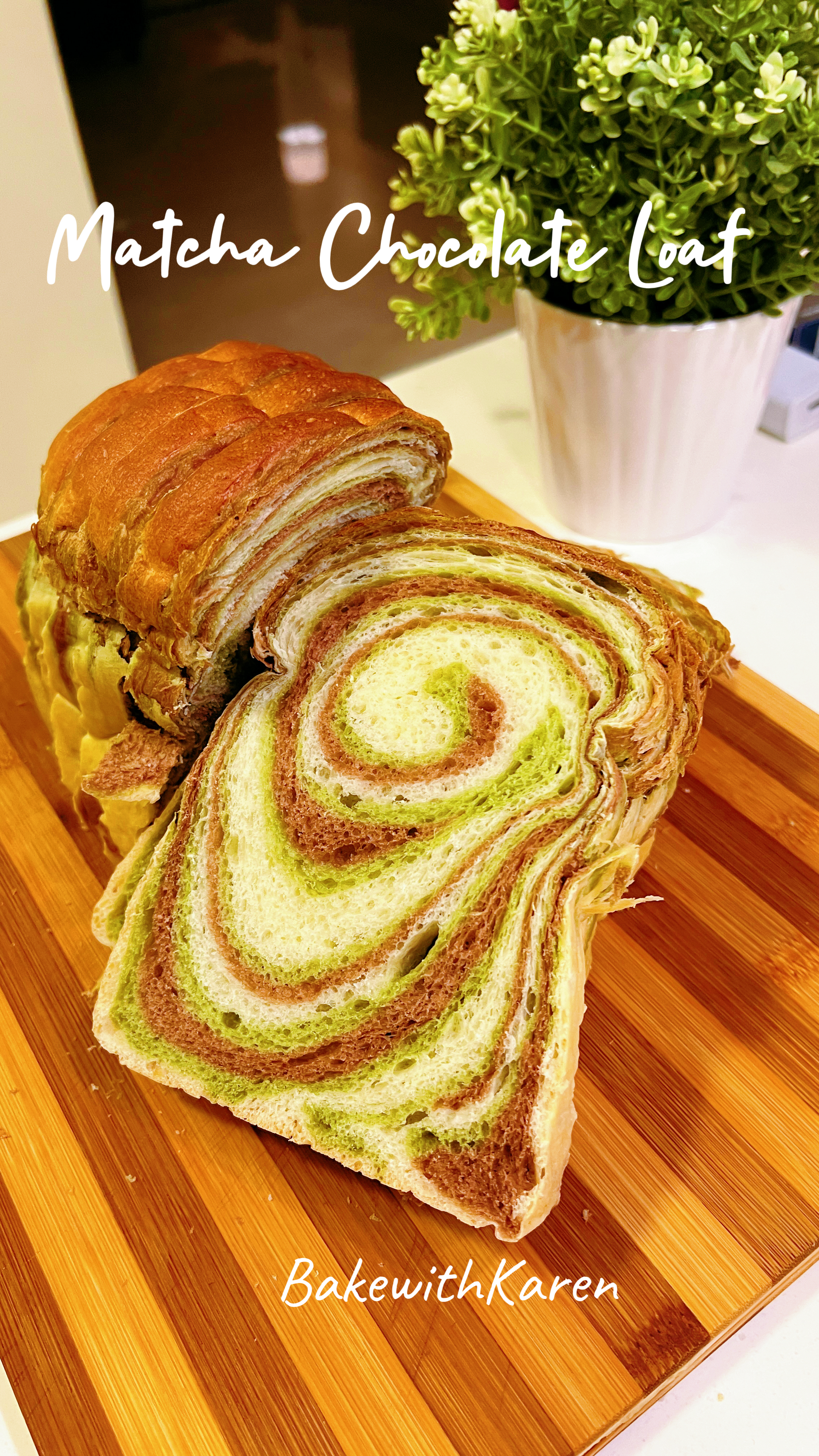 - Shaping~~ roll the dough into a rectangle( all doughs), then put the Matcha dough on top the white dough and chocolate dough on top matcha dough, roll flat, then make three folds, roll with a rolling pin and swiss roll up. Put into a loaf pan. (Or you can cut into three equal dough, make a braided or twisted and tuck in the excess pieces of dough under the bread.)